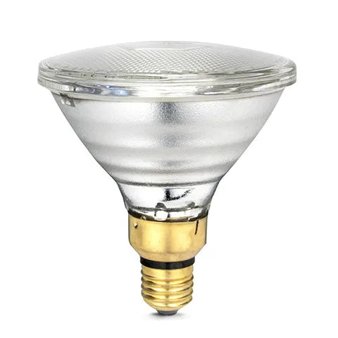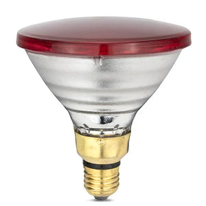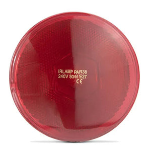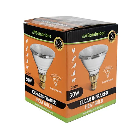 The Infrared Heat Lamp Bulbs - Red & Clear - 50W by Bainbridge are designed to produce broad warmth and optimal heat conditions for various animals. These 50W PAR38 bulbs offer either red light to lessen night-time disruption or clear light to stimulate daylight conditions. The built-in reflector system may help deliver more efficient heating compared to standard glass bulb designs.