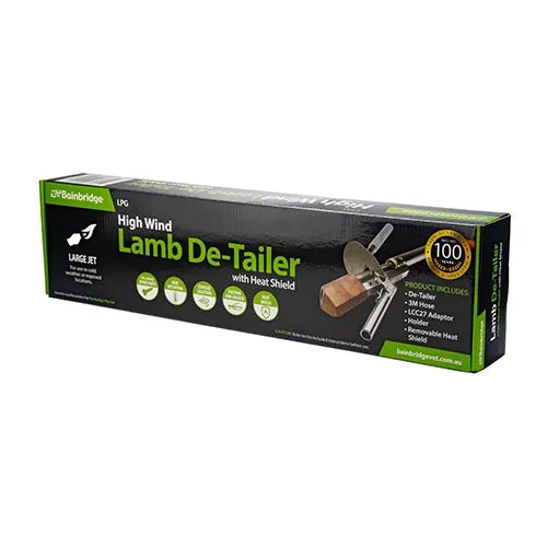 The High Wind Lamb De-tailer is designed for all weather conditions on farms. This complete unit features a larger nipple jet for reliable operation in exposed locations. The high wind model can handle cold temperatures and windy environments during lamb marking season.