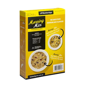 Start your chickens' day right with Morning Mix - Black Soldier Fly Larvae, Banana, & Almonds. This delightful breakfast treat comes in a bright yellow cereal box that makes morning feeding fun. The nutritious blend provides essential nutrients to kick-start your flock's day with energy and health.