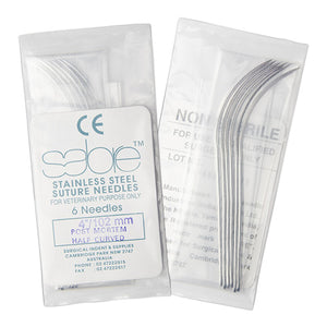 Veterinary post mortem procedures require specialised needles designed for precise examination work. These Post Mortem 1/2 Curved Needles - 4" (110) - 1 Pk feature half curved design for controlled tissue navigation during examinations.