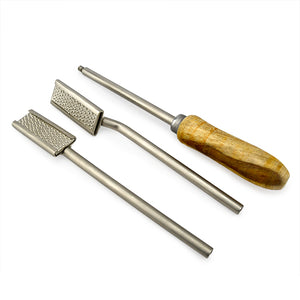 The Tooth Rasp Set features stainless steel construction with a comfortable wood handle. The interchangeable heads give you flexibility for different dental work requirements.